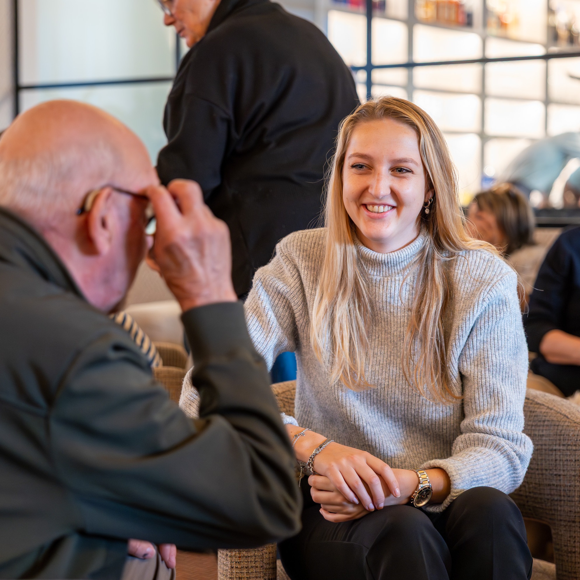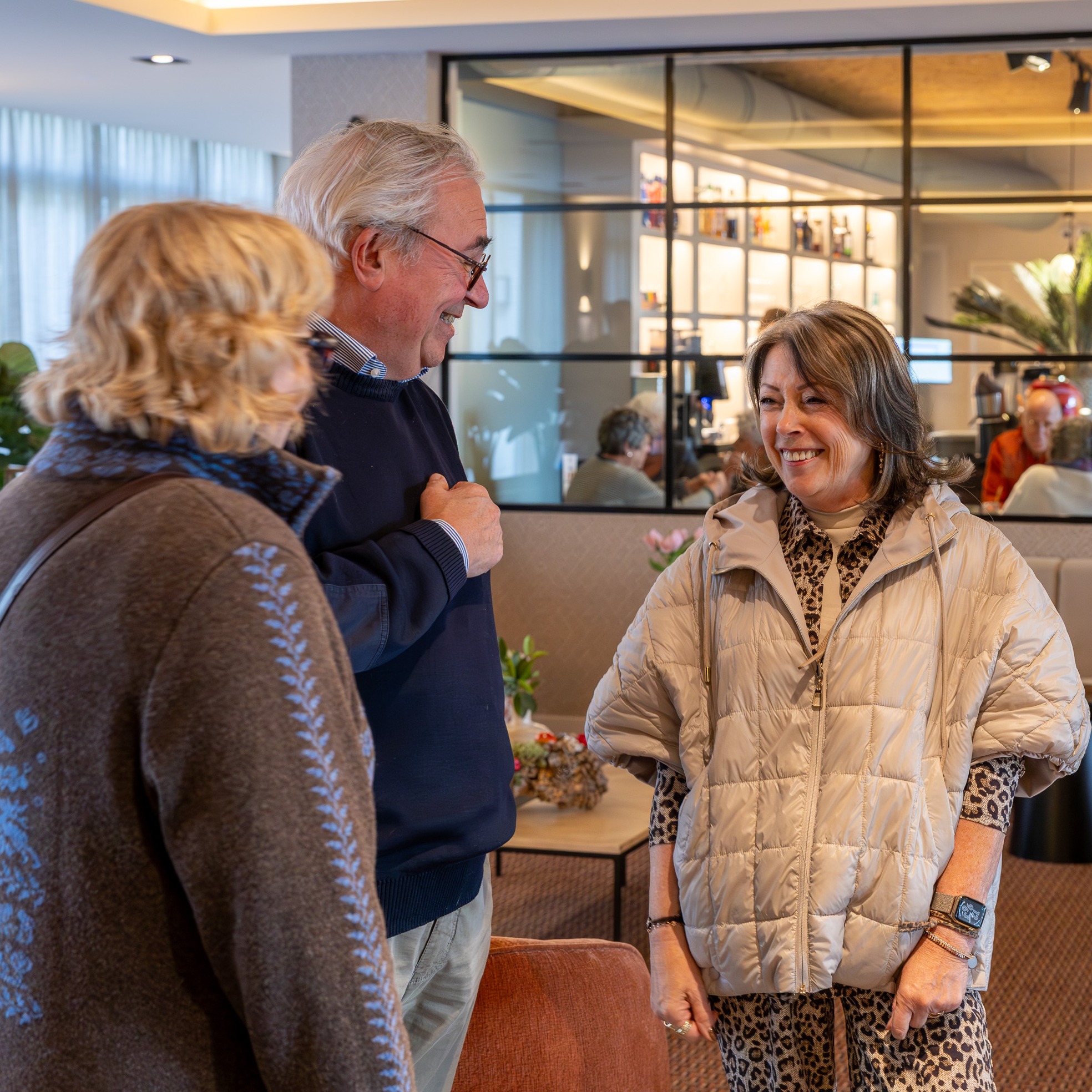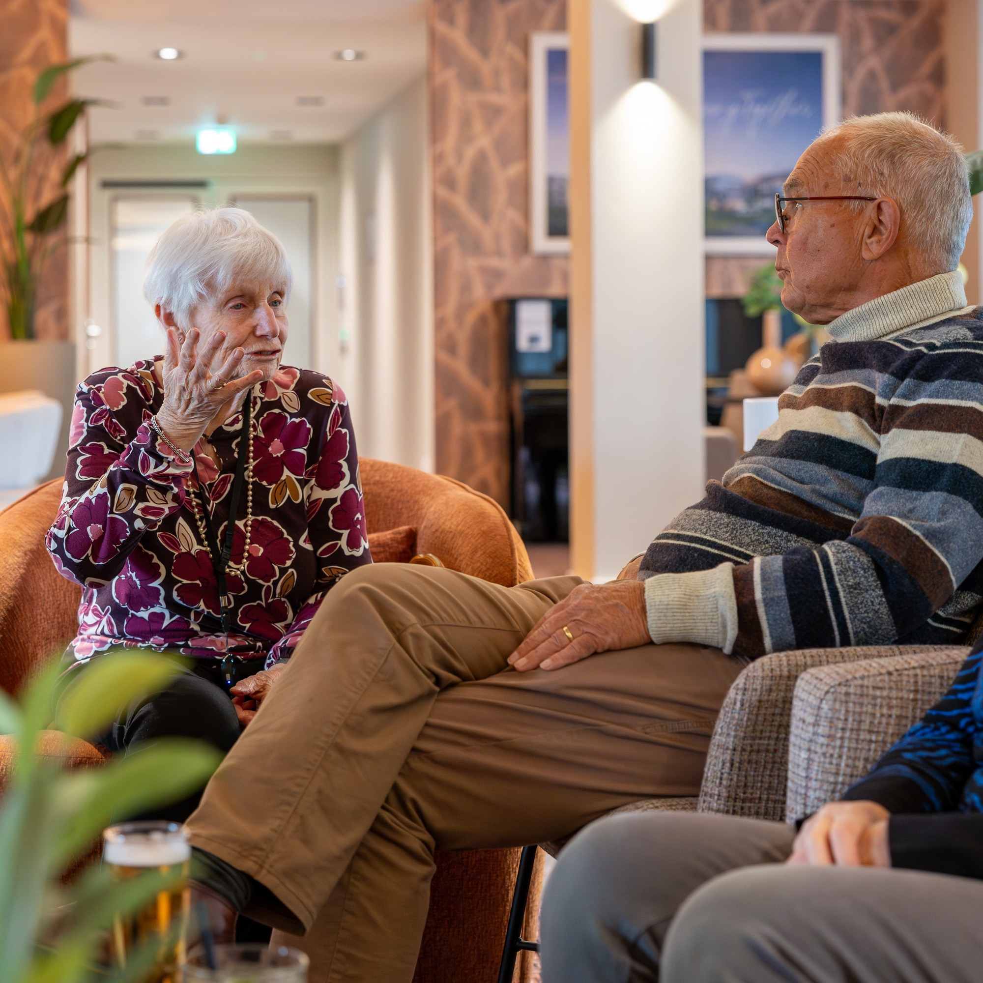 Op de begane grond en in de gezamenlijke ruimtes vind je plekken waar ontmoeting vanzelf ontstaat. Een praatje in de binnentuin, een boek in de leeshoek, een spelletje kaarten of gewoon even zitten in de gezellige horecagelegenheid.